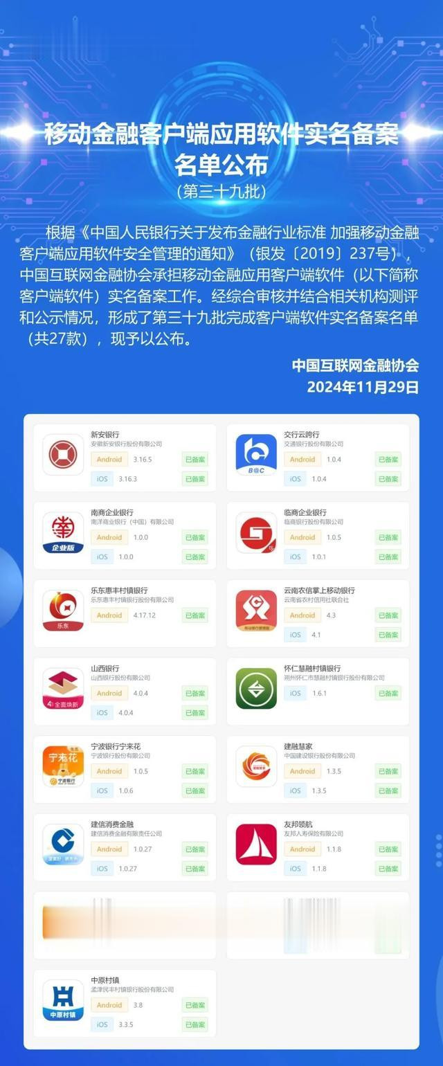 12月9日讯,据中国互联网金融协会官方公众号,建信花消金融、山西银行等27款出动金融App通过备案。